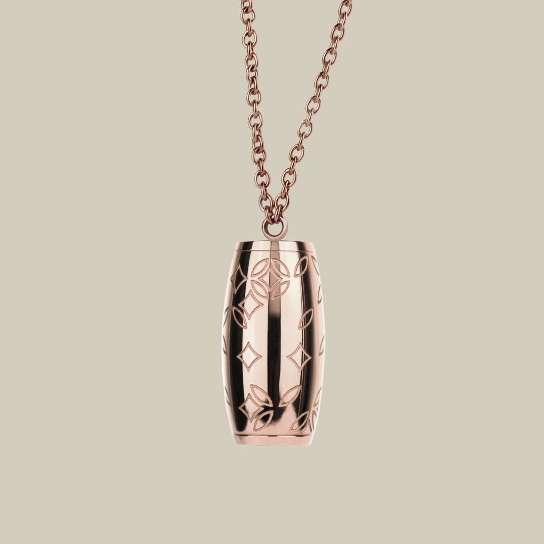 انغمس في رقيّك مع قلادة سيارة ليجاسي من الذهب الوردي من فيذرز. تصميمها الأسطواني الفريد، المزين بنقشنا الحصري، يجمع بسلاسة بين الذوق العصري والسحر الكلاسيكي. ارتقِ بأسلوبك بإضافتها إلى مرآة سيارتك أو كقلادة، لتعكس ذوقك الرفيع.
