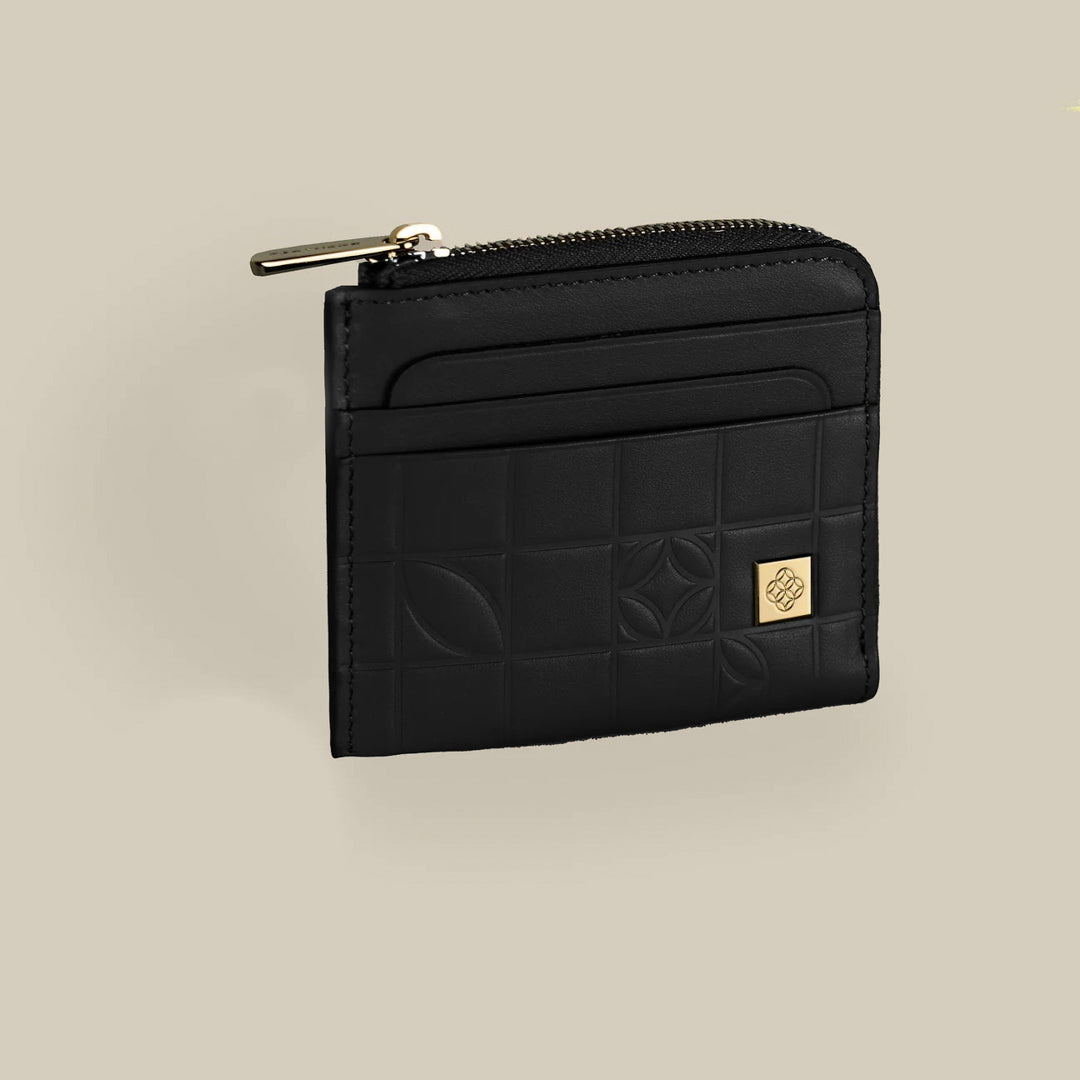 Immerse yourself in elegance with the Black First Sight Round Edge Card Holder. Designed to hold 6 cards from the outside, it includes a top zippered cash pocket with a separated compartment for cash and coins. The creative arrangement of elements makes it a versatile and stylish accessory for the modern woman.