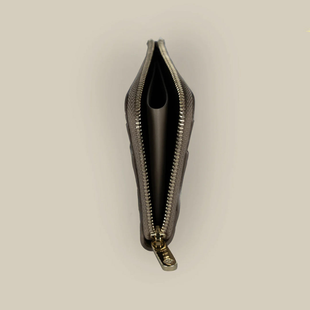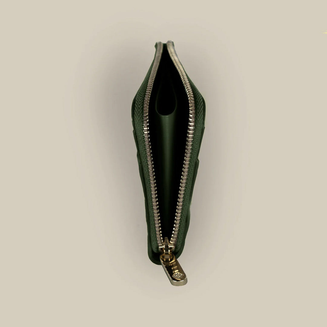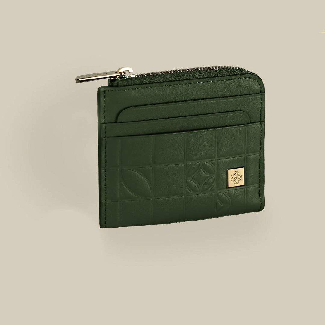 Explore the Green First Sight Round Edge Card Holder. Crafted in Italy with genuine leather, it boasts the feathers brand pattern, creating a distinctive and visually appealing accessory. With features like holding 6 cards and a top zippered cash pocket with a separated compartment, it's an accessory that caters to your daily needs.