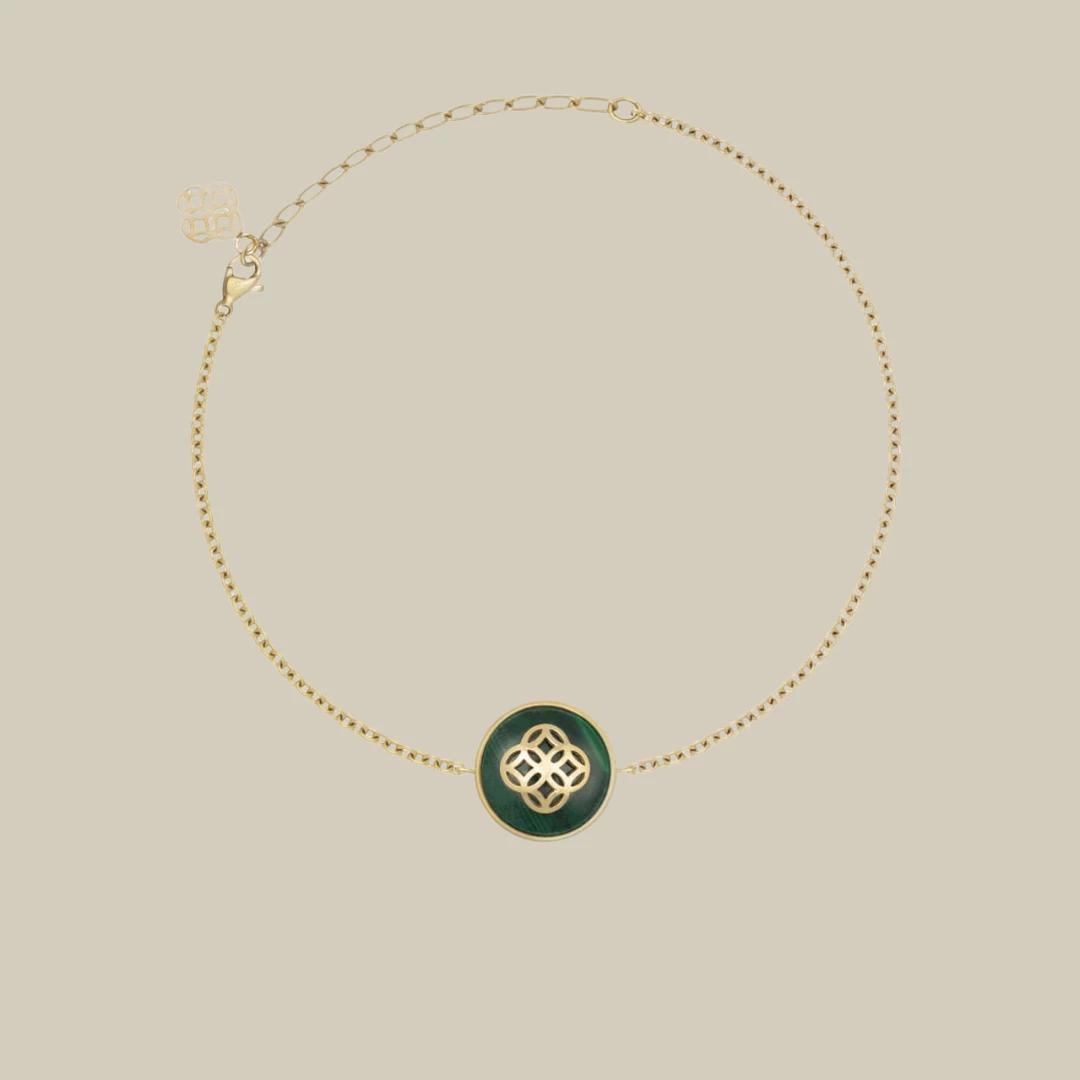 Natural Allure in Malachite: Experience the beauty of nature with the Le Dome Bracelet in enchanting Malachite. Lovingly crafted from stainless steel and plated with 18-carat gold, this bracelet showcases a distinct circular design centered with our signature feathers brand logo. The rich green hues of the Malachite inlay add sophistication and natural charm to your style.