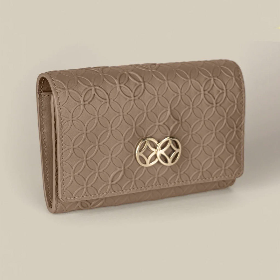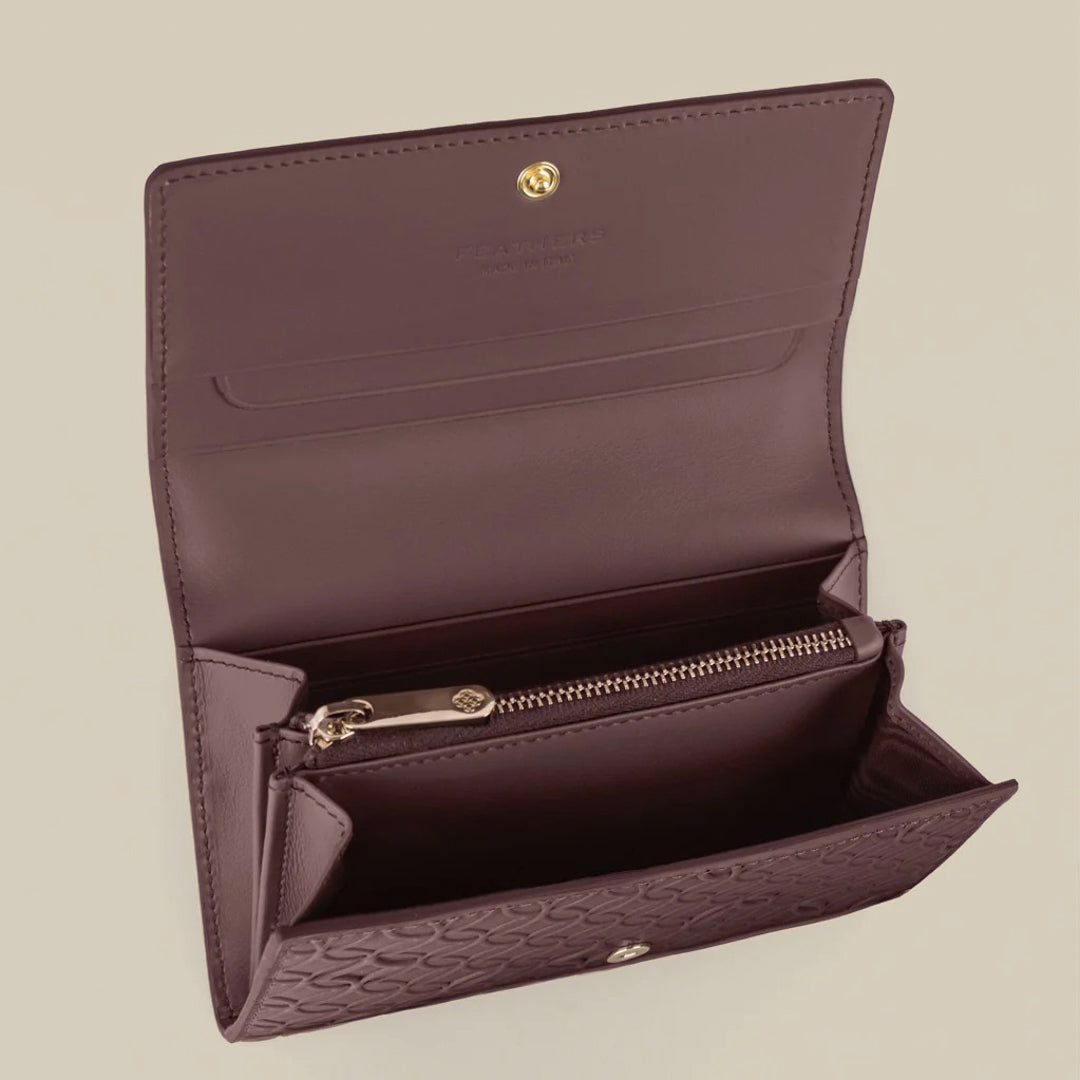 Immerse yourself in sophistication with the Mon Amour Horizontal Wallet. Meticulously crafted, this wallet boasts a thoughtful design with inner zipper functionality for coins, 9 card slots, and 2 money spaces. The feathers brand pattern, with circles showcasing a star, is artfully displayed all over the wallet. Elevate your everyday essentials with this Italian-made accessory that ensures your belongings are not only well-organized but also reflect superior craftsmanship.