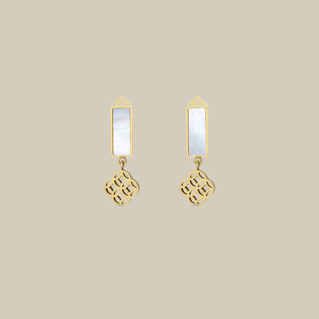 Graceful Rectangles: The New Destiny Earrings in Mop Gold redefine classic elegance with their graceful rectangular design. These exquisite earrings beautifully blend timeless charm with modern sophistication, making them a versatile addition to your jewelry collection. Crafted from stainless steel and plated with 18-carat gold, they effortlessly combine simplicity and sophistication, while the brand logo adds a touch of distinction, creating a captivating accessory for those who appreciate the beauty of subtle design.