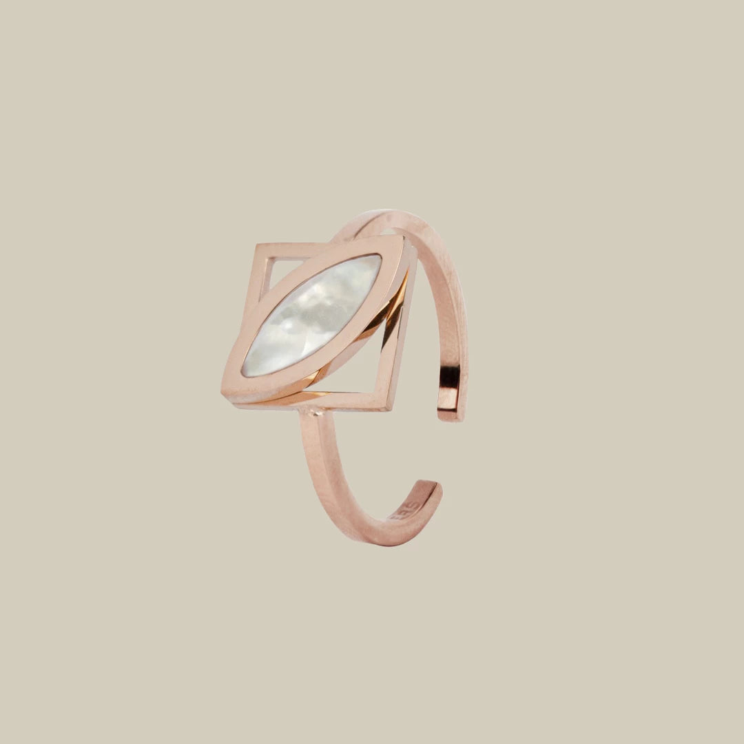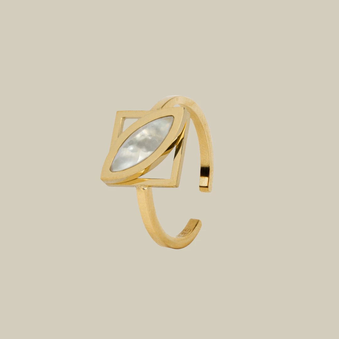 Radiate elegance with the Gold Mop Sunset Ring, showcasing a captivating white mother-of-pearl centerpiece. This ring is meticulously crafted from 18-carat gold-plated stainless steel.