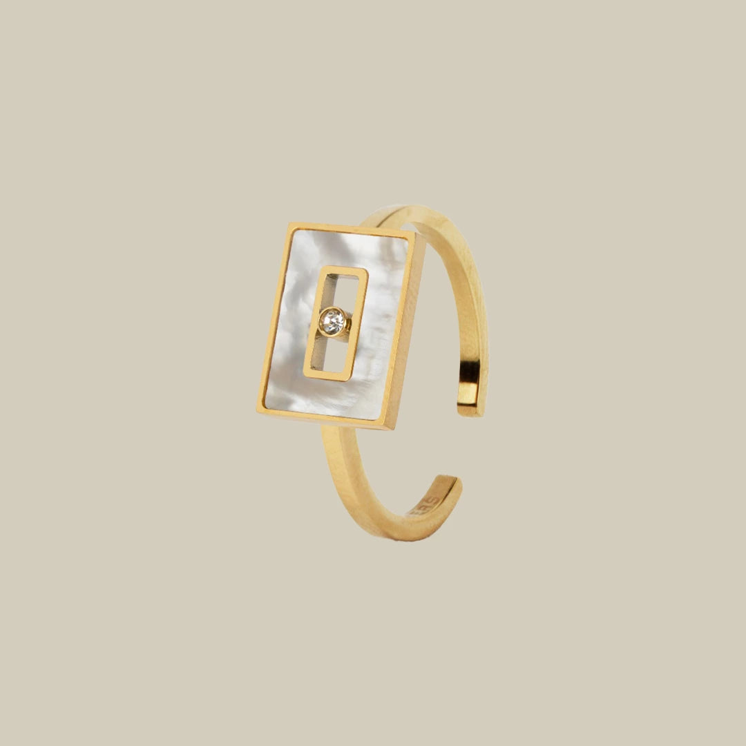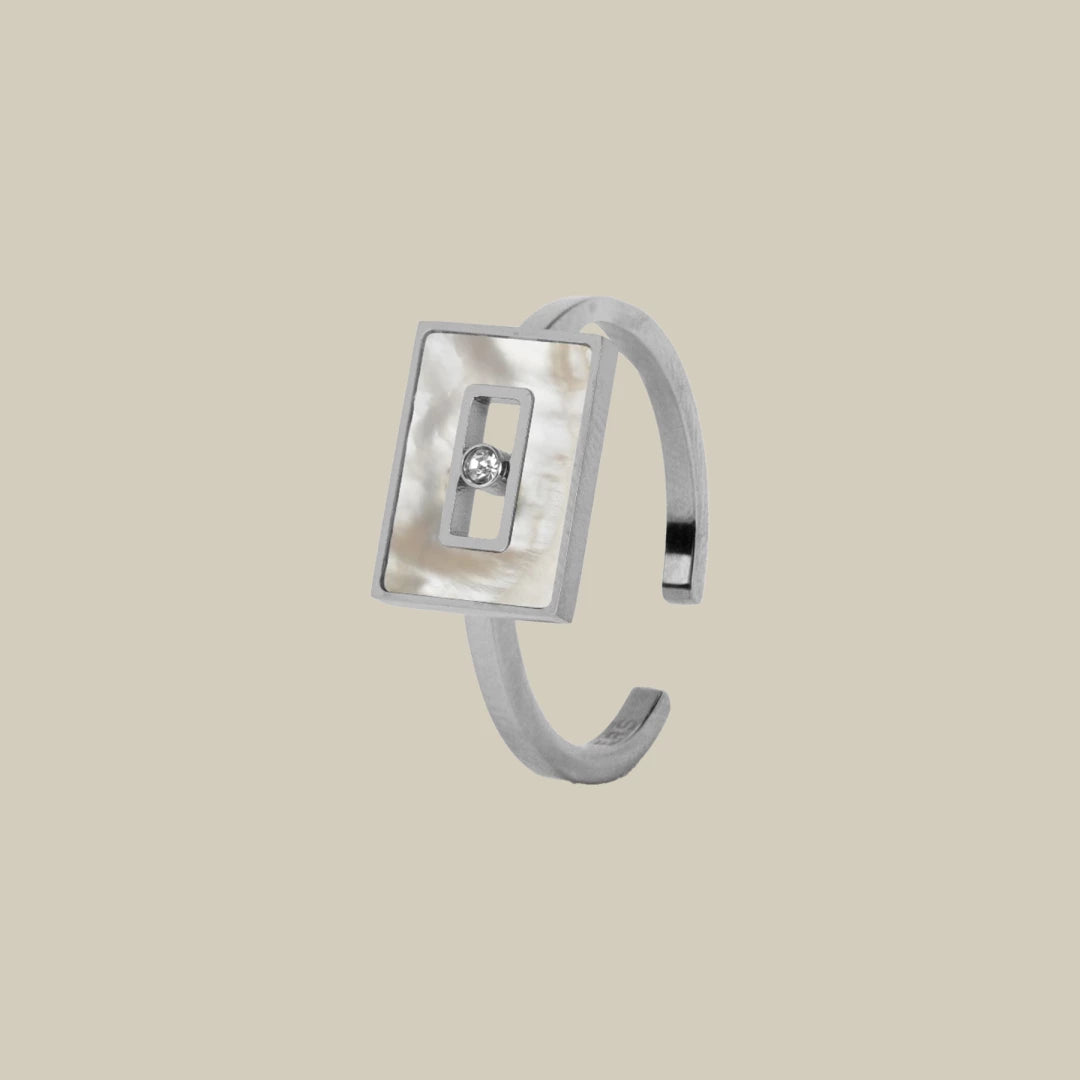 Adorn your fingers with tradition through our Tabla Ring from the Turath collection at Feathers. Inspired by old Emirati jewelry, it brings the past into the present. Crafted from stainless steel and white mother of pearl, it's a unique and regal addition to your collection.